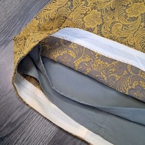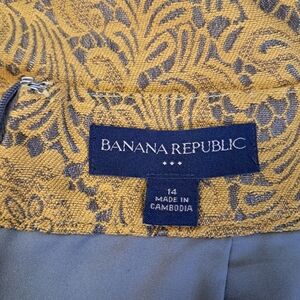 This Banana Republic Women's Skirt in size 14 is a stunning mustard yellow color with a lace look, perfect for adding a touch of elegance to any outfit. The skirt features a floral pattern and a straight & pencil style, making it a versatile and flattering piece for any woman's wardrobe. Made in Indonesia, this skirt is designed for regular size women and has a zip closure for easy wear. The skirt is lined for added comfort and durability, making it a stylish and practical addition to your clothing collection.