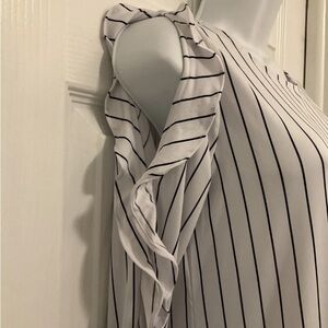 This beautiful Banana Republic blouse is a must-have for any fashion-forward woman. The top is designed with a striped pattern and a round neckline that adds elegance to any outfit. The long sleeve with cold shoulder sleeves adds style and the ruffle accents make it fun.