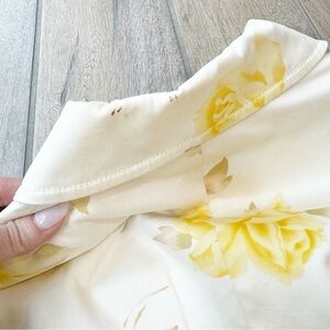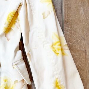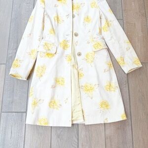 Banana Republic yellow floral button down trench coat. A couple of spots w/ blemishes (back of one of the sleeves and back of the collar) but pretty sure they will come clean. Overall great condition.