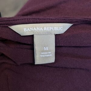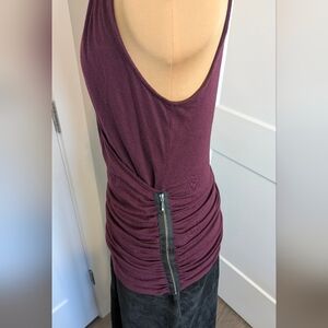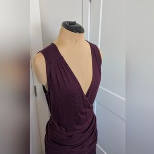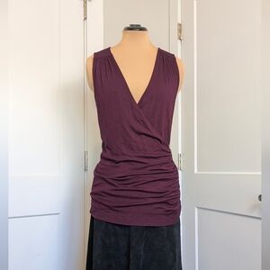 Banana Republic women's sleeveless blouse tunic tank in a rich shade of merlot or plum. Faux wrap front with a deep V neckline. Ruched seams at the hip and waist, and a zipper accent (non-functional zipper) on one side. Soft, stretchy fabric for a comfortable fit.