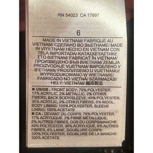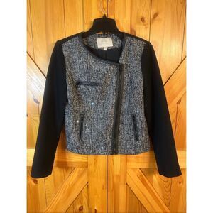 Banana Republic Women’s Tweed Zip Up Jacket. Lined on the back and sides. Black, gray, with sequined detail. Zip front pockets and zip pocket on right chest. Faux leather trim on closure has wear. See pictures. Size 6 (5680)Measurements: Pit to pit 18” Length 20.75”