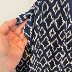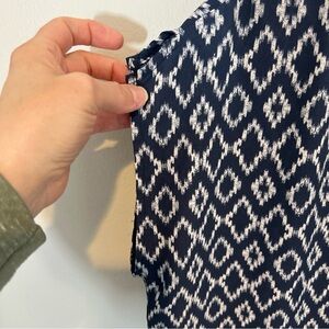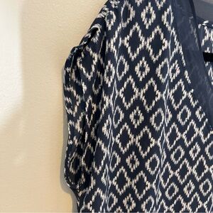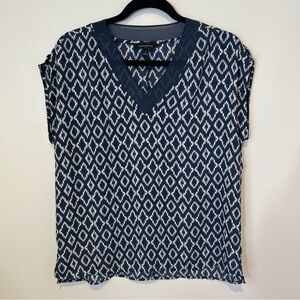 Beautiful lightweight tee. There is a seam down the back, it has a v-neck, cap sleeves with slits at top, and side seams with slits at bottom. The bottom hem is straight and the color is called Sullivan blue which is a navy. It has a diamond print throughout. Great condition. Slightly oversized fit- see measurements. Would look great with some jeans or shorts for a casual day or under a suit coat for a day at the office! It's a versatile piece for any closet.