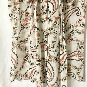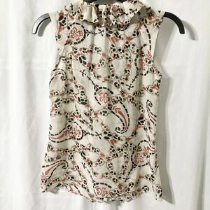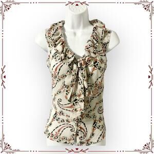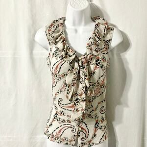 Banana Republic brand. Size women's extra extra small petite. Ruffle neckline sleeveless button down blouse. Tie front. Rounded pearl buttons. Pattern is similar to paisley. Rather sheer. In preloved condition, no visible flaws (see photos for condition, if applicable); as with any preowned clothes, you should wash before wearing the first time. Made of 100% polyester. From a pet friendly home.