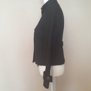 Black felted wool Brown faux leather wrap buttons Neck button tap Wrist button taps Back has a half strap detail Fully lined Excellent pre-owned condition! Timeless sophistication Size: XS Approx.: 16.5' pit-to-pit/ 15.5' across middle (waist area)/ 21' length
