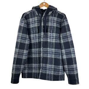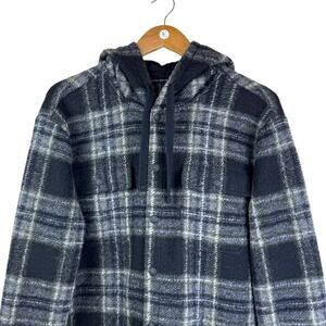 Banana Republic Wool Black Plaid Hooded Shirt Sweater Button Up Jacket Pockets