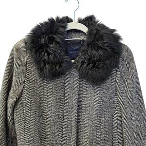 Really nice wool blend coat that has a chevron pattern and faux fur trim on the collar. The trim is not removable. Hidden button down closure and front slit pockets.