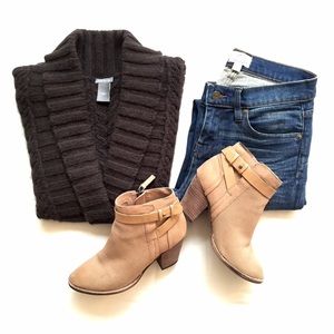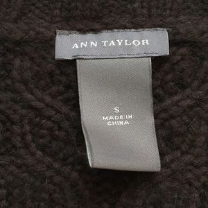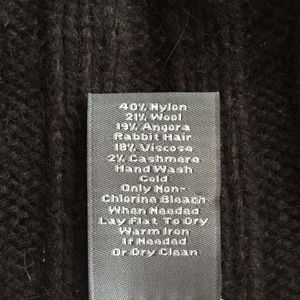 This chunky chocolate colored sweater is perfect for fall. It is low cut in the front so a camisole or other top is necessary underneath. Looks great with jeans and booties. Dry clean only.