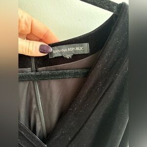 Banana Republic Wrap Velvet Sleeveless Jumpsuit in black. Zip back. Button snap to secure front wrap. Matching velvet tie belt. Straight legs. Size 20.