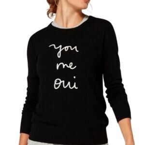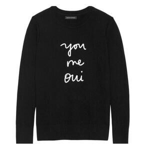 Add a touch of charm to your wardrobe with this Banana Republic "YOU ME OUI" Italian Merino Wool Pullover Sweater in size small. Crafted from premium Italian merino wool, this slim-fit crew neck sweater features a stylish "YOU ME OUI" knitted design across the front. With a chest measurement of 17" and a 22.5" length, it offers a flattering silhouette and cozy feel. Pre-owned in excellent condition and machine washable, it’s perfect for layering or wearing on its own. A chic and playful addition to any closet!