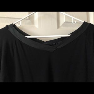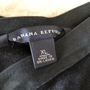This is a black Banana Republic long sleeved shirt. It has a wide neck line and a small v-neck lined with black ribbon material. Super classy and comfortable. Would look great worn casually, at the the office or dressed up for an evening out! Photo lighting doesn’t do it justice, it a nice deep black with no fading.