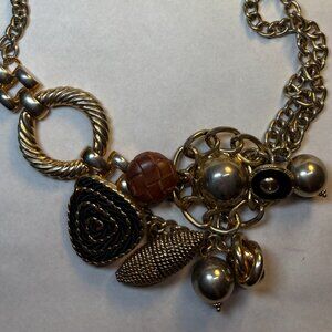Originally $119. Beautiful, chunky statement necklace with lots of interesting charms such as buttons, balls, rings, and more. 20" long. Gold color with brown and black accents.