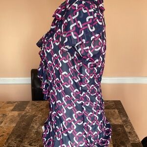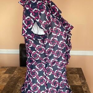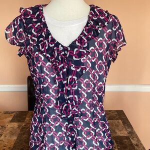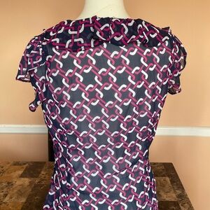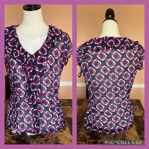 Geometric design sheer cap sleeve top in EUC. Ruffles at neckline and down the front (hidden button closure. Measurements laid flat are approximately 19” armpit to armpit and 24” length. Machine wash cold, tumble dry low.