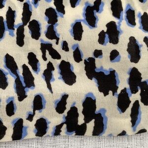 Silky blue and black cheetah print blouse with ruffled sleeves. Size medium. Some small imperfections - two small snags (see photos) but difficult to see due to pattern. Key hole button in the back of the blouse (some wear on this as well). This blouse is still in great condition with a lot of life left!