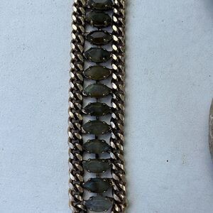 Simple and stylish and oh so pretty !! Dark gray glass stones secured by two old gold colored curb chains with a single closure . 7 inches in length.