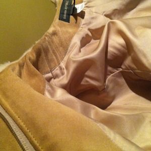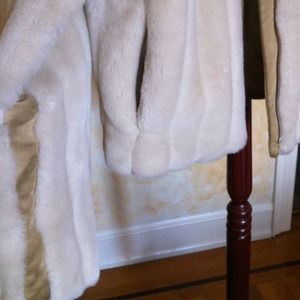 purchased brand new from Banana Republic, worn twice. size M. off-white faux fur with tan leather trim on underside of sleeves, along zipper at front, around inside of neck, and at bottom of coat in back. faux fur 80% acrylic, 20% polyester. regular shell lining, 50% nylon, 50% acetate. trim 100% leather. hits at waist, extremely warm and cozy. fabulous condition, looks brand new except for slightly darker leather inside back trim and neck. two pockets at sides, one interior pocket in lining.
