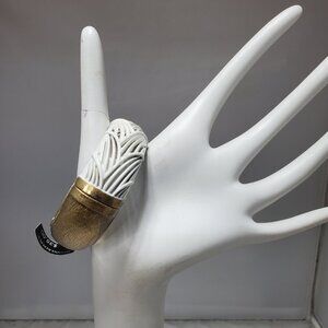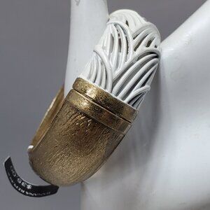 Banana Republic bangle bracelet features a striking two-tone design, with one half in textured gold-toned metal and the other in smooth white enamel with an Art Deco-inspired pattern. It is a hinged bangle with a magnetic closure.