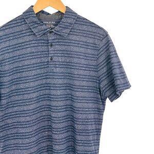 Banana Republic gray and navy stripe polo shirt size large. Gently used condition see photos for measurements, details and fabric content