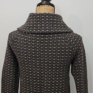 Banana Republic gray & taupe mock neck long sleeve sweater jacket, snap closure, wool/nylon/viscose/acrylic/cashmere/alpaca blend, size Small. Excellent pre loved condition, measurements in pics, smoke free home, ships next day. All eBay terms apply. All sales final. Please ask any questions prior to bidding. Thank you for your interest in my items!