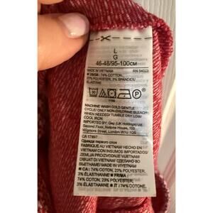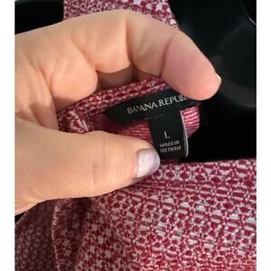 This is a beautiful red and white woven top that buttons with large buttons in the back size large 73% cotton 23% polyester 3% spandex. Made in Vietnam pre-loved excellent condition.