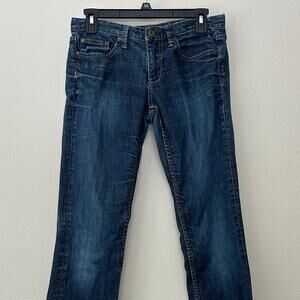 Banana Republic denim blue jeans. They are a medium-to-dark wash, low-rise, and feature a straight or bootcut leg style. Made from a comfortable stretch denim blend, they are perfect for everyday wear. The jeans have classic five-pocket styling and a zip fly closure.