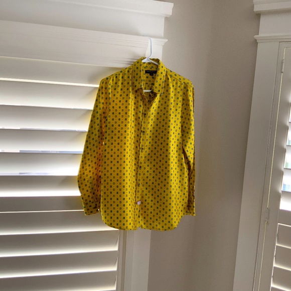 This blouse is yellow with paisley accents and has long sleeves. It button down the front. It is in excellent condition and made of silk.