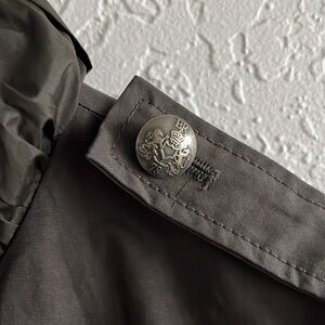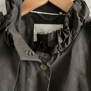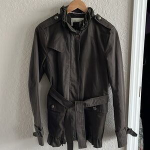 The cutest trenchcoat you’ll ever see ruffle details at the neck and at the bottom. In perfect condition with barely any signs it’s been worn. Size medium. Oiled effect so it’s somewhat water resistant. Machine washable.
