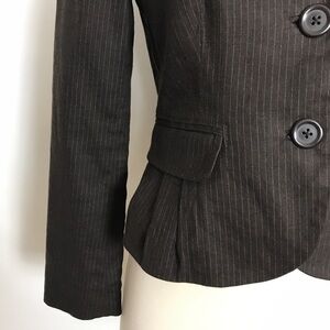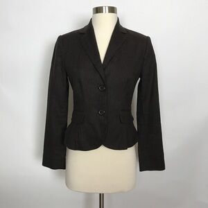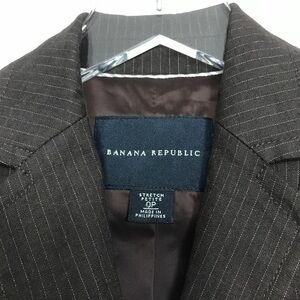 Banana Republic stretch petite blazer, size 0P. Blazer has two front buttons and pockets with pleats. Pleats are repeated on the back. Lining is chocolate brown. This blazer could be styled with casually with jeans or more formally for a work environment. Excellent pre-used condition.