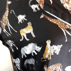 collared neck, long sleeves, button front, chest pocket, silky fabric, zoo animals, 100% polyester, could be worn as a regular top
