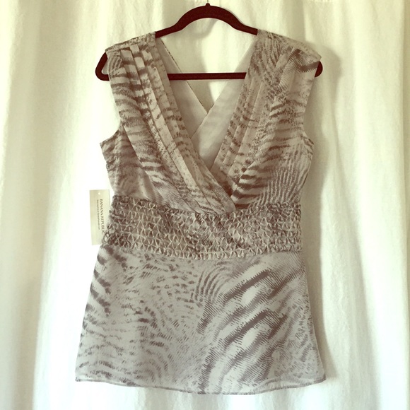 Banana Republic tank top with grey pattern in Size 6. Side zipper for easier wear. Even comes with snaps on the shoulders to attach to your bra strap so top stays in place. Great for work or a night out. Simply a gorgeous top. Brand new never worn condition.