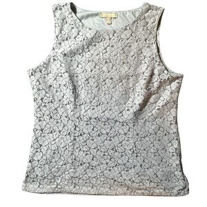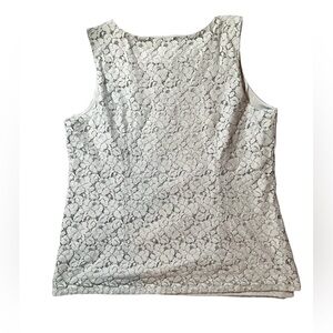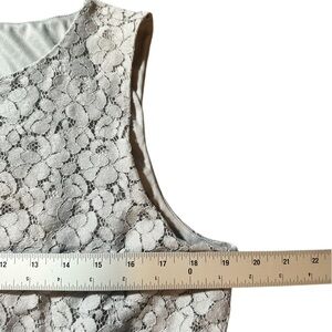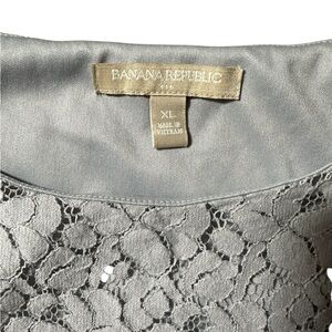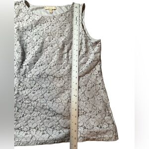Gently used, no flaws. The color is a soft gray with a lace overlay and a solid lining layer beneath.