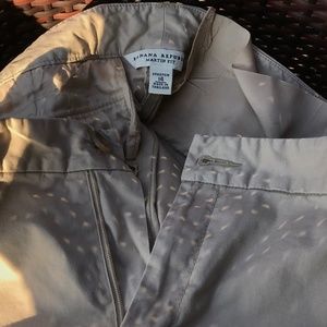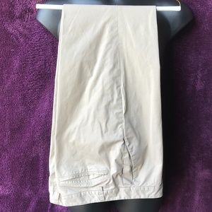 Classic vintage 93% cotton, 7% spandex, Martin Fit chinos in the moderate tan color, not ultra light like one of the pix. Slant side pockets, waistband small buttoned pocket. Waist 17.5” measured flat across; inseam about 33”.
