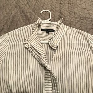White poly blouse with grey stripe detail. Gorgeous ruffle neckline.