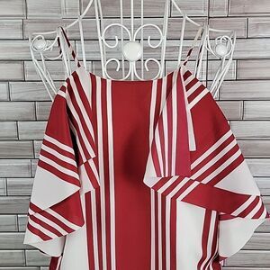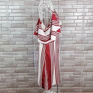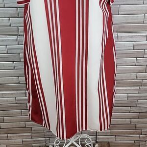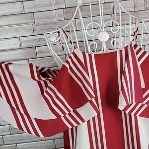 This is a statement piece dress with its bold red and white vertical stripes by Banana Republic. 100% polyester fully lined off the shoulder spaghetti straps with a straight line skirt midi. Lovely and in great pre-owned condition.