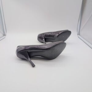 These classic black leather heels from Banana Republic feature a sleek stiletto design with a 3-4 inch heel and a rounded toe box. The glossy finish and clean lines make them perfect for professional or formal occasions, offering timeless elegance and versatility.