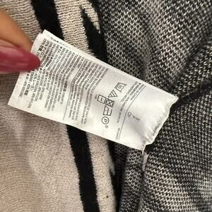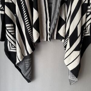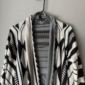 Banana Republic women's size small black and white knit cardigan. Features an open front, asymmetrical hem, and geometric pattern. Made in China. No visible imperfections. Pre-owned.