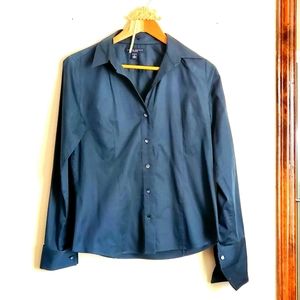 Structured button up top with princess seams front and back tapering to the waist. Stretchy and flattering. Beautiful deep forest green with silvery buttons. Good condition.