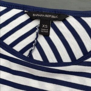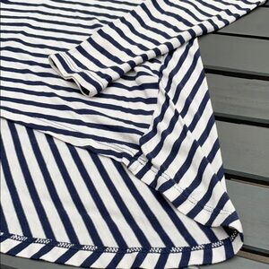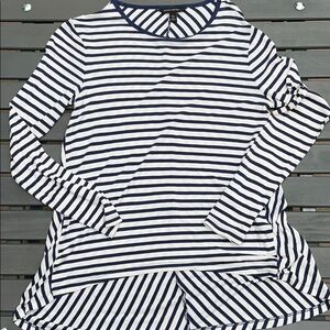 Long sleeve, cream and navy top with stripes on the front and chevron back. Top is super soft and is perfect with jeans or navy bottoms. There is one tiny hole on back of arm and sleeve (see photos) priced accordingly. Listing is for top only.