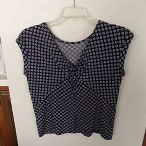 Cute dark navy Banana Republic top with a circle dot pattern. 95% polyester/5% spandex. Size small, but it has a lot of stretch. Front neckline is a little wider than a traditional crew neck, and back is a V with a twist detail. You could probably even reverse it! Tags attached, never worn. (FYI: clothing tag says Banana Republic, retail tag says Banana Republic Factory)
