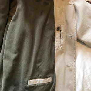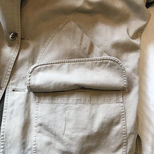 Men's Medium Banana Republic khaki chore coat in great condition. Tortoise shell color buttons, lots of exterior pockets, 2 interior pockets, brown leather collar, corduroy cuffs, and olive green interior.