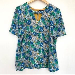 Excellent condition, no visible flaws, Banana Republic v-neck top with flutter sleeves, blouse top, Raglan cut sleeves. Keyhole back opening with button closure. Loose fitting, straight cut. Polyester fabric in a bright floral print with gold lining.