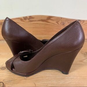 Like new Banana Republic brown leather wedge heels with adjustable peep toe front. Please see photos for design details and ware.