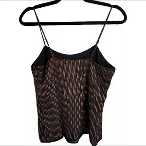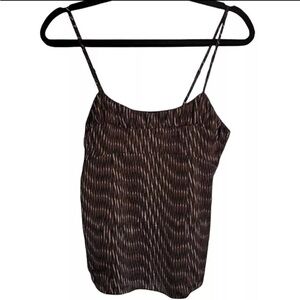 The top has thin spaghetti straps and a slightly gathered neckline.The pattern consists of vertical stripes in alternating shades of brown, black, and off-white, creating a textured visual effect.