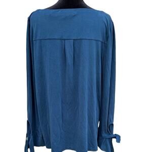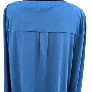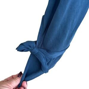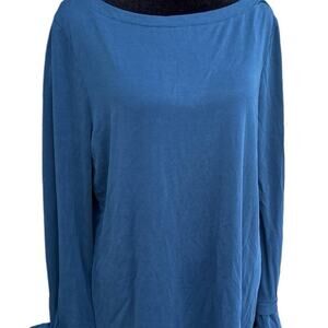 Banana Republic women’s size L blouse. Rounded neck, long sleeves that have a tie at the wrist. Blue. Dressy. Stretch. Model polyester blend fabric.