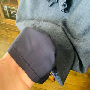 Banana Republic women’s sleeveless ruffle chambray blouse, 95% wool but lightweight, ruffle bib detail, 1-button closure on back.