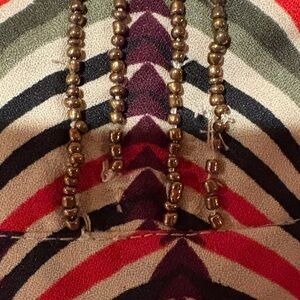 Banana Republic women's tank top featuring a chevron pattern in multiple colors including red, yellow, black, and white. The tank top has a V-neck with beaded detailing around the neckline and down the center front. It is sleeveless and made of a lightweight material, suitable for warmer weather or layering. Perfect for adding a pop of color to your wardrobe. Please check photos for more details regarding exact sizing, and compare to your favorite items at home to insure correct fit for you. See beading near hemline