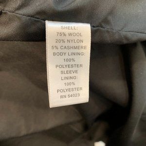 Thick comfy wool coat for winter weather. Fabric is 75% wool and 25% nylon with polyester lining. Measures 19" across the shoulders and 25" from neck to bottom of jacket. Very good condition with no visible wear, no odor, no stains.