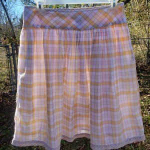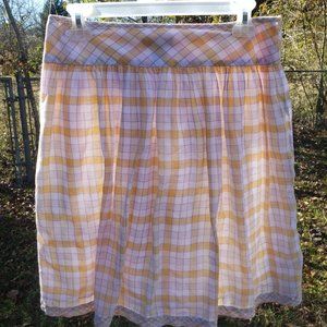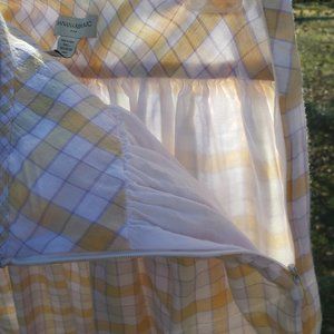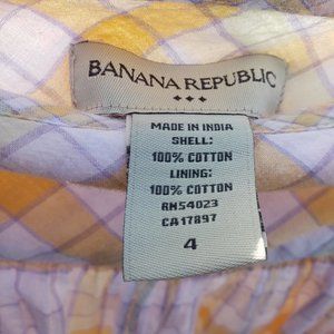 Gently used yellow and white checkered skirt by Banana Republic size 4. No holes or stains. Approximate measurements laid flat are: waist 28", length 22". Features are: lined, zipper/hook closure on left side, 100% cotton.