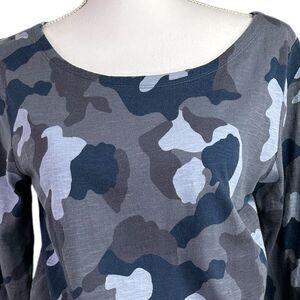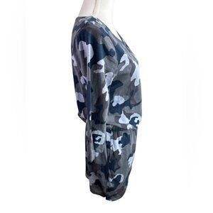 Stylish camouflage print dress with a tie waist. Features a mix of gray, black, and white colors.