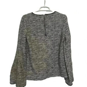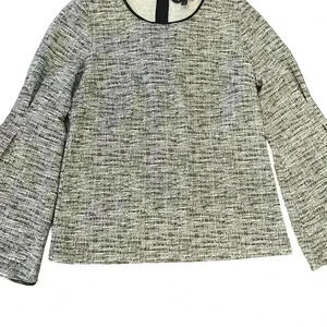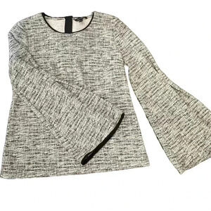 This is a Banana Republic women's bell sleeve top. It has a crew neck, long bell sleeves, and a straight hem. The top is made from a soft, stretchy matte jersey fabric with a black and white textured pattern.