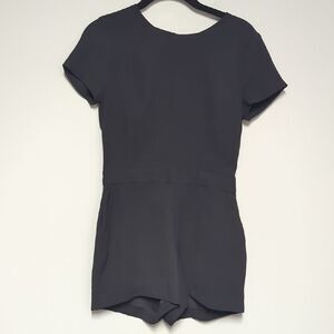 This elegant black jumpsuit from Banana Republic features a round neckline and short sleeves, creating a sleek and streamlined silhouette. Crafted from a stretchy, form-fitting fabric, it offers both comfort and style for any occasion.